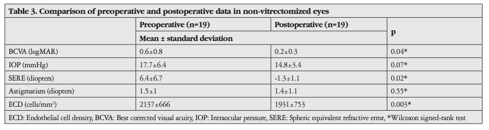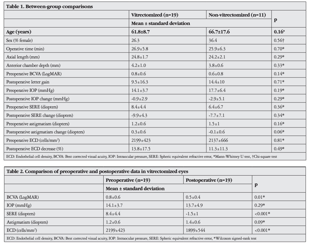 Results: There were no significant differences between the groups in terms of demographic data, operative time, baseline anatomic and functional measurements, or postoperative changes in these measurements (all p>0.05). Postoperative best corrected visual acuity was significantly higher than preoperative values in both groups (both p<0.05). Complication rates did not differ between the groups (all p>0.05). In both groups, endothelial cell density was significantly lower at postoperative 1 year compared to preoperative measurements. There was no significant difference between groups regarding endothelial cell loss (p=0.49). One vitrectomized eye had corneal decompensation. Other complications included hyphema, transient increase of intraocular pressure, secondary glaucoma, pupillary irregularity, and dislocation of ICIOL. Mean operative time was 26.4±5.9 minutes.